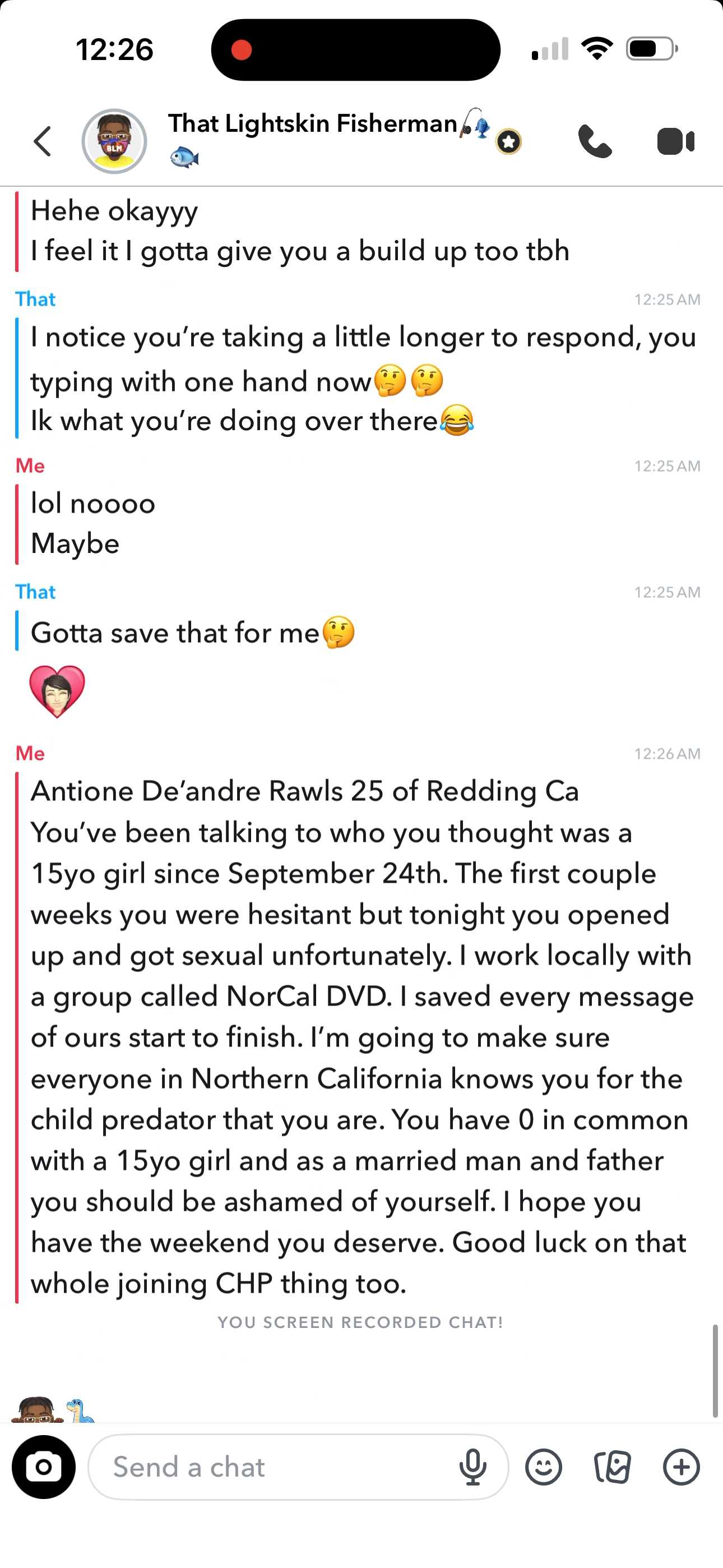 Esai was caught by us Nov 8th 2024 in Chico arranging to meet with a 14yo female for sexual acts and consuming marijuana. Fast forward to November 8th a year later and here we are posting him again for trying to meet with a 16yo trans boy (a male transitioning to female) it was made clear I was a minor and from there he tried to video chat to confirm our identity to be true. At that point we unfortunately had to reveal ourselves to him and end conversation. These are the chats from this week between him and the trans decoy